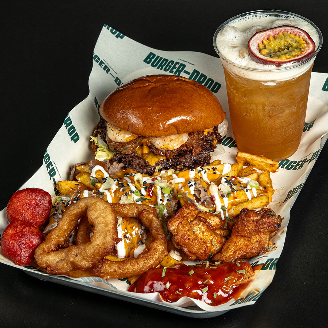Burger + Loaded Fries + 2 Wings or 1 Tender + Shake/Mocktail
