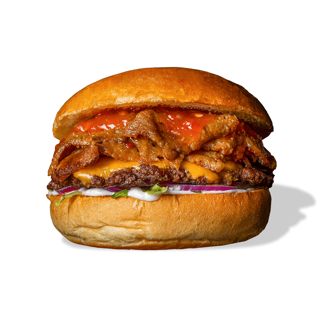 One smashed beef patty, Turkish doner, American cheese, iceberg lettuce, Dutch onion, chilli mint sauce & garlic sauce