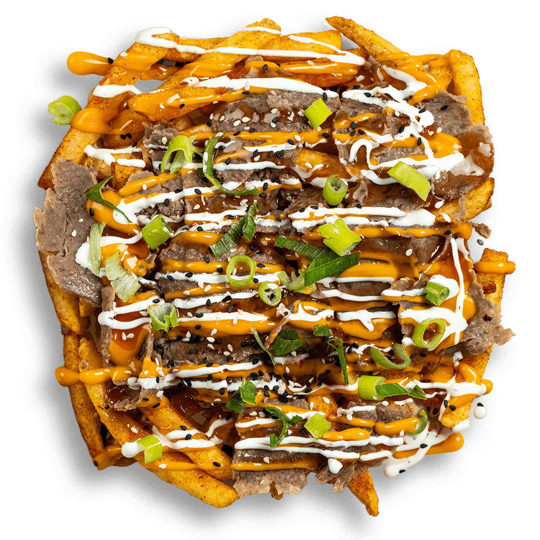 Shawarma chicken, cheese sauce, garlic sauce, spring onions & sesame seeds